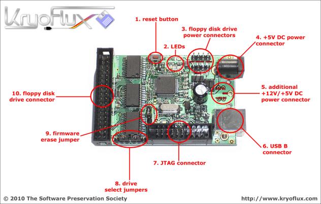 KryoFlux, ou toute autre alternative, permet de connecter un lecteur via le connecteur standard 34 broches que l’on retrouve dans de nombreux lecteurs 5 ¼ et 3 ½ ; certains lecteurs 8’’ peuvent également fonctionner. L’alimentation est fournie par la carte, mais vous pouvez aussi alimenter le lecteur par une alimentation externe. Le tout est connecté à un PC ou un Mac via l’USB.
