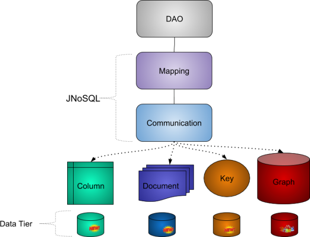 Jakarta NoSQL est constituée d'une couche de communication (Diana), qui fournit un ensemble d’API conçues pour définir la communication avec les bases de données NoSQL. Diana contient quatre modules en fonction de chaque type de base de données NoSQL: clé-valeur, famille de colonnes, document et graphique; et une couche de mappage (Artemis), qui fournit un ensemble d’API permettant aux développeurs d’intégrer des applications Java à des bases de données NoSQL. La couche de mappage est basée sur les annotations et utilise des technologies telles que CDI et Bean Validation, dans l'intention d'en simplifier l'utilisation par les développeurs. Artemis est l'équivalent de Hibernate pour les SGDBR traditionnels.