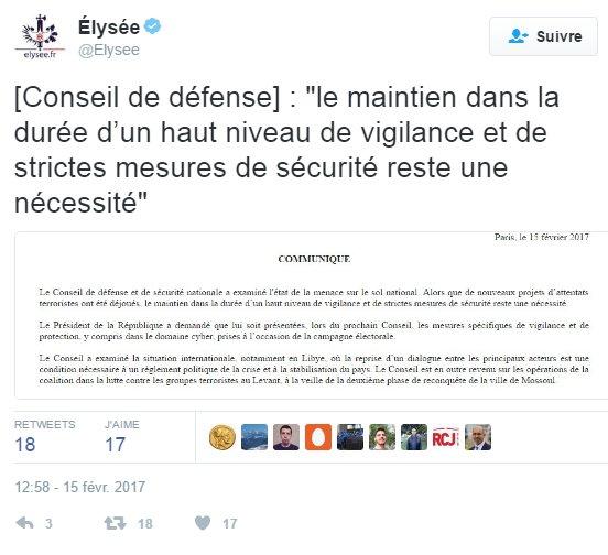 Pour cela, le président de la République a demandé que lui soient présentées, lors du prochain Conseil, les mesures spécifiques de vigilance et de protection, y compris dans le domaine cyber, prises à l’occasion de la campagne électorale a indiqué l'Elysée dans un communiqué relayé sur Twitter.