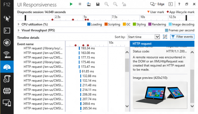 Le débogage JavaScript est amélioré, avec la possibilité de poser des points d'arrêts sur des événements.  Le profiler propose des analyses enrichies en ce qui concerne la gestion de la mémoire ou la réactivité de l'interface utilisateur.