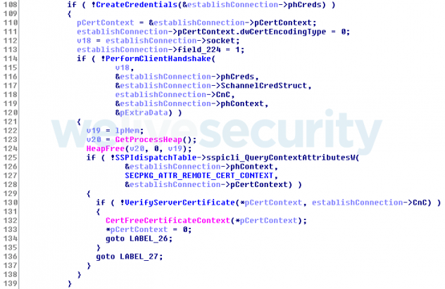 DePriMon communique en toute sécurité via TLS, mais pas à un niveau élevé comme dans le cas typique des programmes malveillants, remarquent les chercheurs d'ESET. La connexion est initialisée avec un socket Windows et peut continuer avec l'initialisation d'une session SSPI (Security Support Provider Interface) authentifiée avec le SSP Negotiate / NTLM. Après cela, DePriMon utilise Schannel.