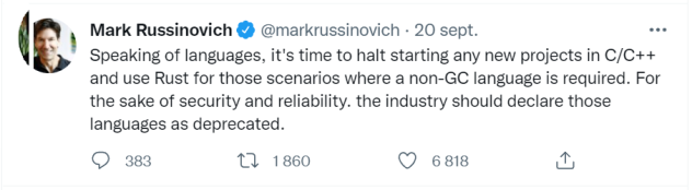 En parlant de langages, il est temps d'arrêter de démarrer tout nouveau projet en C/C++ et d'utiliser Rust pour les scénarios où un langage non-GC est requis. Par souci de sécurité et de fiabilité. L'industrie devrait déclarer ces langues comme obsolètes.