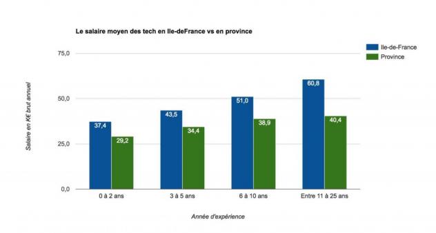 Les rémunérations moyennes en Ile-de-France sont globalement plus élevées que les salaires des tech travaillant en province :