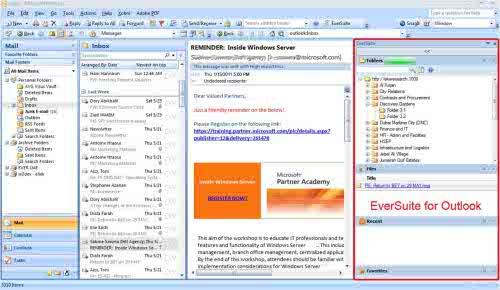 La solution EverSuite for Outlook s’intègre à Outlook sous la forme d’une nouvelle fenêtre. Elle permet, au travers d’un simple glisser-déposer, d’intégrer les informations contenues dans les e-mails et les pièces jointes (quelque soit leur format) dans les dossiers de la GED sous SharePoint. Les méta-données des documents peuvent être renseignées automatiquement ou manuellement. Il est également possible de paramétrer des règles d’intégration automatique des e-mails, qui éviteront ainsi toute erreur de manipulation. En fonction de leurs habilitations et droits d’accès, les collaborateurs peuvent proposer des contributions et accéder à des informations émanant de leur messagerie et de leur poste de travail. Enfin, le système assure une gestion dynamique des versions des documents intégrés.