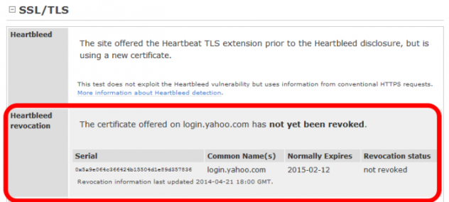 Dans un billet de blog, Netcraft montre clairement que Yahoo n'a pas révoqué son certificat, et indique qu'il en est de même pour Twitter,LinkedIn, Facebook, Apple, FedEx, PayPal and American Express, et Schneier on Security.