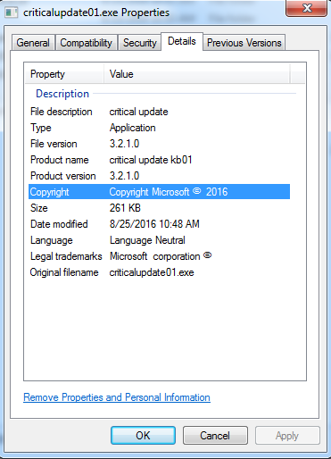 Un premier exécutable maquille ses propriétés afin de faire croire qu'il provient de Microsoft et qu'il s'agit d'une mise à jour critique.