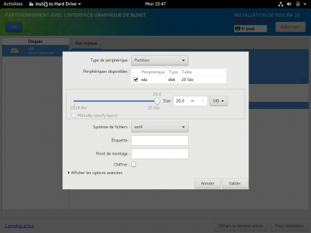 Utilisation de l'interface graphique de blivet pour le partitionnement dans l'installateur Anaconda, en plus de l'interface traditionnelle. L'objectif est de fournir une autre approche pour cette étape cruciale afin de satisfaire les besoins du plus grand nombre, c'est pourquoi l'interface traditionnelle reste disponible. L'approche d'Anaconda était top-down, à savoir que l'utilisateur définissait ses points de montage et ses propriétés afin qu'Anaconda définisse les partitions correspondantes et leur agencement. Avec blivet, c'est plutôt l'inverse car les disques et leurs états sont affichés pour que l'utilisateur puisse concevoir les partitions et volumes logiques avant de définir à la fin les points de montage. Cette interface est donc plus proche de ce que propose gparted.
