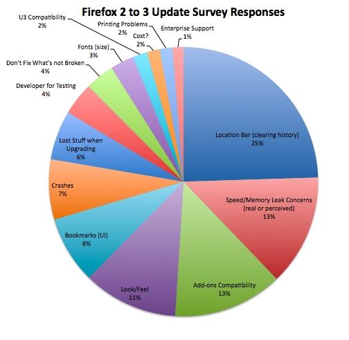 Ce nombre impressionnant compte-t-ils les téléchargements pour downgrader ? L'histoire de ne le dit pas. Mais il est vrai que de nombreux utilisateur downgradent vers Firefox 3.0 (votre serviteur a été contrait de le faire avec le tout premier Firefox 3.5) ou restent à la version 2.x. La fondation Mozilla s'est intérrogée sur les raisons de cela et publie dans un billet de blog les résultats de cette enquête: