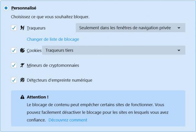 Vous pouvez activer ces deux fonctionnalités en vous rendant dans les Options du menu principal de Firefox 69, et en cliquant sur l'onglet Vie privée et sécurité. Dans la section Blocage de contenu, cliquez sur Personnalisé. Il ne vous reste plus qu'à cocher les cases comme illustré ci-dessous.