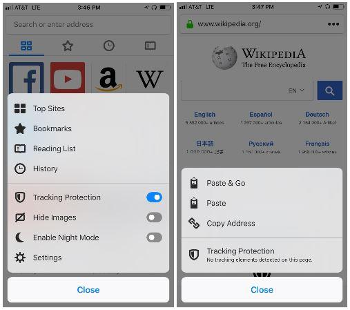 L'internaute peut contrôler pour quels sites la protection contre le pistage doit être activée et pour quels sites ce n’est pas nécessaire. Il suffit simplement d’appuyer sur le bouton menu et la protection contre le pistage apparait dans la liste des options par défaut.
