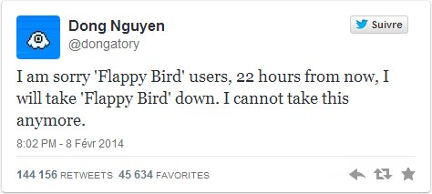 Et d'un seul coup, à la grande consternation des addicts à Flappy Bbird, le jeu est retiré de l'App Store et de Google Play par son auteur, Dong Nguyen, un programmeur vietnamien. Officiellement celui-ci ne supporte plus ce succès.