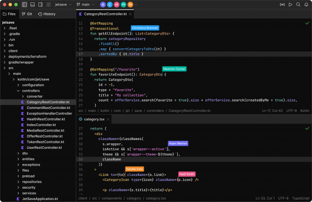 Fleet permet de travailler sur du code à plusieurs. Mais il est plus qu'un simple éditeur partagé : vous pouvez également partager des terminaux et des sessions de débogage, réviser le code, le parcourir et bien plus encore, le tout sans aucune configuration.