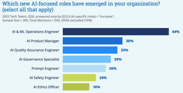 "L'émergence de nouveaux métiers axés sur l'IA illustre cette transformation, représentant une évolution significative des structures organisationnelles et des besoins en talents. Les entreprises créent des postes spécialisés pour gérer, mettre en œuvre et superviser l'intégration de l'IA dans l'ensemble de leurs opérations. L'ingénierie opérationnelle IA et ML est en tête de cette transformation avec un taux d'adoption de 64 %, suivie par les postes de chef de produit IA (36 %) et d'ingénieur assurance qualité IA (33 %). Cette diversification s'étend au-delà de la mise en œuvre technique et englobe d'autres aspects, avec une montée en puissance des spécialistes de la gouvernance IA (29 %), des ingénieurs prompteurs (26 %), des ingénieurs sécurité IA (20 %) et des responsables éthiques IA (16 %)." explique le rapport.