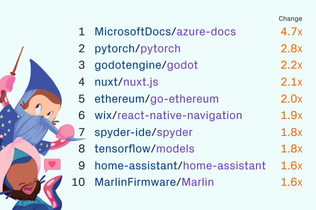 Cette année seulement, ce sont d'innombrables projets qui ont vu le jour, lancés par des particuliers ou par de plus grosses équipes. Des projets tels que Definitely Typed, Godot, Kubernetes, PyTorch, et beaucoup d'autres ont escaladé la liste des projets à la croissance la plus rapide.