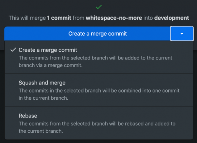 Lorsque vous fusionnez, vous avez également désormais la possibilité d'écraser et de rebaser dans le cadre de votre fusion.