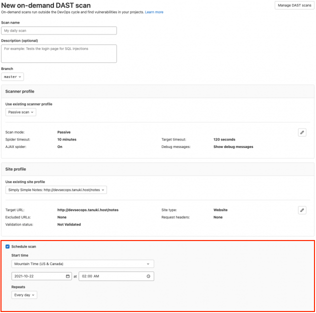 Avec ce nouveau planificateur, vous pouvez définir une analyse DAST pour qu'elle s'exécute soit une fois à une heure précise dans le futur, soit de manière récurrente. Si l'ajout de DAST à vos pipelines n'est pas une option pour votre organisation, ou si les réglementations de sécurité ou de conformité de votre région nécessitent la planification d'une analyse, cette fonctionnalité permet de créer facilement une analyse planifiée pour répondre à vos besoins. L'analyse peut être associée à la branche par défaut.