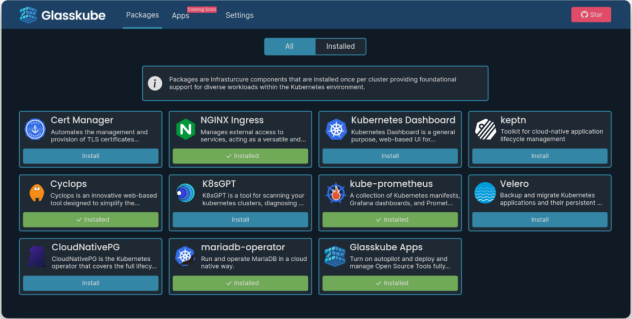 Glasskube est conçu pour vous aider à installer vos packages Kubernetes préférés à l'aide de son interface utilisateur pour une complexité réduite et une transparence accrue. Est également proposée une CLI inspirée de Brew pour les utilisateurs avancés. Les packages Glasskube tiennent compte des dépendances, comme on comme tout gestionnaire de packages. Glasskube est comme une application cloud native, afin que vous puissiez suivre votre approche GitOps.