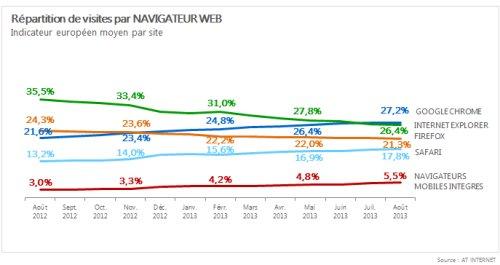 D'après ce baromètre, Chrome détient désormais 27,2% de parts de marché, devant Internet Explorer à 26,4%. Il est à remarquer qu'Internet Explorer a perd près de 10 points en une année.