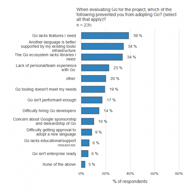 Si cette enquête est globalement un satisfecit de Google, la question de savoir pourquoi Go n'est pas plus universellement adopté a été étudiée. Essentiellement, c'est en raison d'un manque de fonctionnalités et de bibliothèques nécessaires à un projet.
