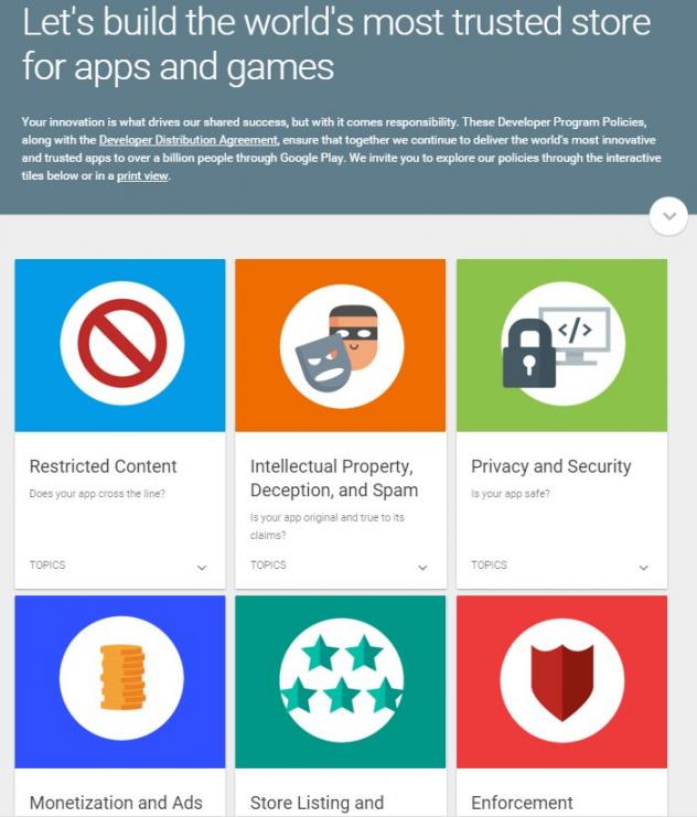 La refonte propose un regroupement par thématiques, qui doit permettre aux développeurs de trouver plus rapidement les informations qui les concernent. Contenu non autorisé, respect de la propriété intellectuelle, sécurité et respect de la vie privée, monétisation et publicité, le renforcement de la sécurité sur le Play Store, etc.
