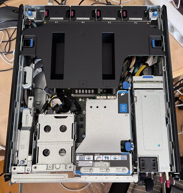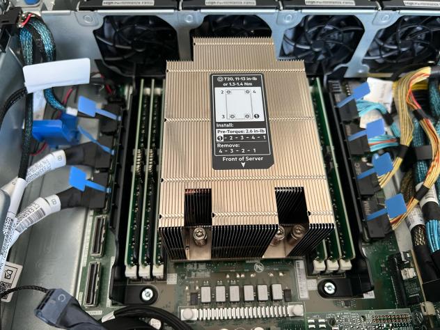 Le capot se retire en quelques secondes. On découvre alors l’intérieur du ProLiant : tout est modulaire et facile à retirer et à installer. Le plus impressionnant est le bloc CPU et les slot DDR5. L’AMD Epyc 8004 est important avec ses 64 cœurs et son énorme dissipateur.