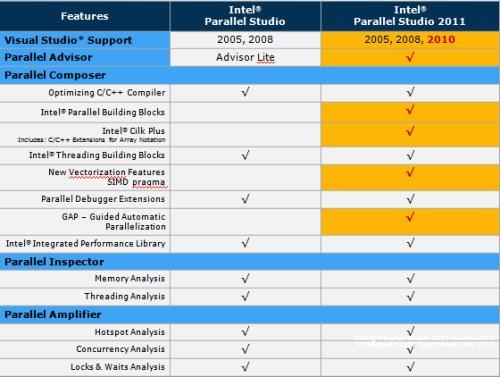 On bénéficie de deux nouveaux outils : Intel Parallel Building Blocks (pour paralléliser les données et les tâches), Intel Parallel Advisor (pour le design parallèle). Et la gamme Parallel Studio 2011 inclue le support « premier » de l’éditeur avec support technique illimité et mise à jour valable un an. L’édition 2011 supporte Visual Studio, Intel TBB 3 et un compilateur amélioré sur les automatismes parallèles. Intel met en avant désormais trois lignes d’outils : Parallel Studio, Compiler (édition professionnelle) et Cluster Toolkit. Un des credo de la version 2011 est l’intégration des outils entre eux pour avec un cycle de vie de développement mieux intégré et un support élargi des versions de Visual Studio.