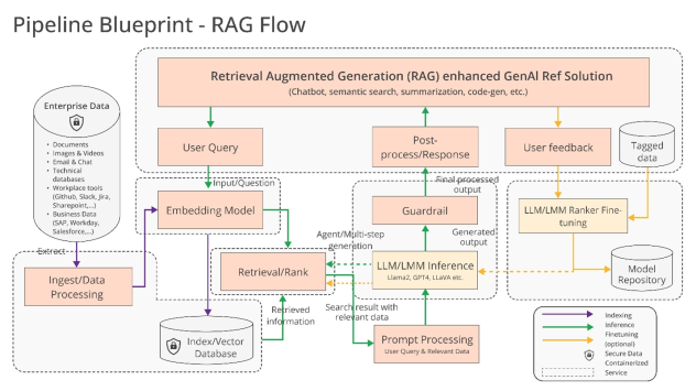 Très impliqué dans ce projet, le fondeur Intel en a publié une présentation détaillée. Intel souligne que OPEA offre une vue holistique et simple d'un flux de travail GenAI qui inclut la génération augmentée de récupération (RAG) ainsi que d'autres fonctionnalités selon les besoins. Les éléments constitutifs (ouverts et propriétaires) de ce flux de travail incluent :