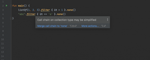 En ce qui concerne l'écriture de code Kotlin, il est désormais possible de simplifier la syntaxe et de combiner plusieurs appels en un seul lorsqu'IntelliJ IDEA appelle des méthodes d'une chaîne à l'intérieur d'une collection.