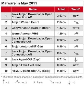 D'après le rapport de mai de G-Data, les failles de sécurité sous Java ont encore été un terrain fertile pour les attaques virales ce mois. Il est à préciser que beaucoup sont liées aux non-mises à jour régulières de Java par les utilisateurs. Quatre programmes malveillants du top 10 ciblaient des failles de sécurité Java corrigées par Oracle depuis mars 2010 ! Un autre point notable est la présence croissante des PUPs (Potential Unwanted Programs ou logiciels potentiellement indésirables) dans les menaces détectées.