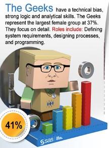 - Geek (41%) : naturellement porté sur la technique, avec de grandes capacités logiques et analytiques, il représente le plus grand groupe au sein des data scientists. Porté sur les détails et les faits, il ne fonde pas ses décisions sur les émotions.