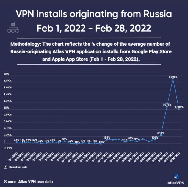 Ceci selon le fournisseur Atlas VPN. Selon les données internes de l'entreprise, les installations de réseaux privés virtuels (VPN) en Russie ont bondi de 1 906 % au cours des derniers jours. Toujours selon Atlas VPN, l'intérêt pour les VPN a commencé à augmenter le 16 février 2022, après la première vague de cyberattaques contre l'Ukraine.