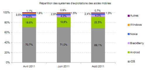 iOS, le système d’exploitation mobile d’Apple représente 69,1% des accès aux sites Internet via ces équipements de consultation internet en mobilité. Il devance ainsi le système d’exploitation de Google, Android, avec 22,5%, dont la part augmente de près de 4 points en 5 mois. La part des terminaux BlackBerry, malgré une légère baisse en début de période estivale, reste stable avec 4% des accès mobiles aux sites du classement CybereStat en août 2011.
