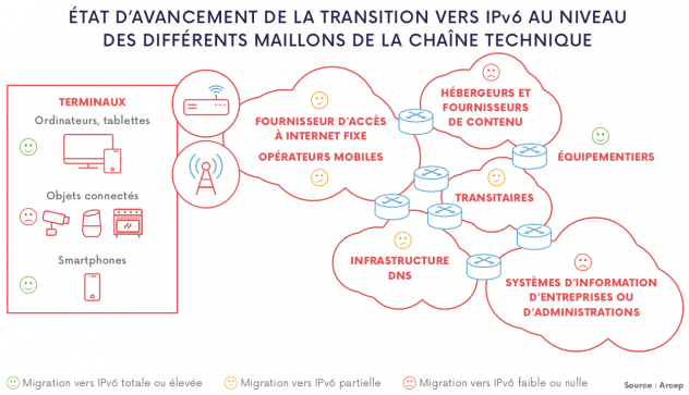 Dans son rapport, l'Arcep met en exergue de grosses différences dans l'adoption d'IPv6 selon les maillons de la chaine technique