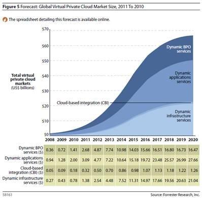 Le marché global du Cloud computing devrait passer de 40,7 à 240 millions de dollars entre 2011 et 2020, selon la dernière recherche Forrester. Basé sur l’étude catégorielle du marché du Cloud de Forrester, ce nouveau rapport présente les différents marchés et leur dynamique concernant trois couches principales du Cloud : le Cloud public, le Cloud virtuellement privé (voir graphique ci-dessous) et le Cloud privé. Ce rapport nous donne la taille actuelle et future des 12 segments distincts du Cloud jusqu’en 2020. Le Cloud computing continue d’évoluer et participe de manière important à la croissance de l’industrie high-tech dans son ensemble. Les acteurs du marché devraient constater des changements majeurs dans l’usage de la structure, des plateformes softwares et des applications professionnelles durant les dix prochaines années. Voici les scénarios :