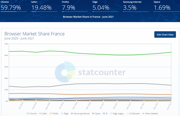 La France apprécie Firefox. Celui-ci détient 7,9% de parts de marché devant Edge à 5.04%.