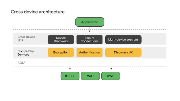 Ce SDK fournit une couche d'abstraction logicielle qui gère tous les aspects de la connectivité inter-appareils, en tirant parti des technologies sans fil telles que Bluetooth, Wi-Fi et bande ultra large. Le SDK fait tout le gros du travail sous le capot et offre aux développeurs une API modulaire et indépendante de la connectivité qui prend en charge la communication bidirectionnelle entre les appareils et est rétrocompatible avec Android 8. De plus, les applications n'ont pas à déclarer ou demander des autorisations d'exécution pour l'un des protocoles de connectivité sous-jacents utilisés (tels que BLUETOOTH_CONNECT , BLUETOOTH_SCAN , ACCESS_FINE_LOCATION , etc.), et l'utilisateur peut autoriser les applications à se connecter uniquement au(x) périphérique(s) sélectionné(s).