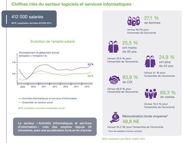 En 2015, avec plus de 37 000 embauches réalisées, ce qui représente une amélioration de 8% sur l'année précédente, le secteur était le premier recruteur de cadres. Selon Syntec Numérique, cette tendance sera elle aussi confirmée en 2016