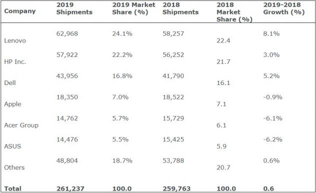 Selon le tableau d'estimation des ventes de PC en 2019 ci-dessous, ce sont les constructeurs Lenovo, HP et Dell qui profitent cette hausse.