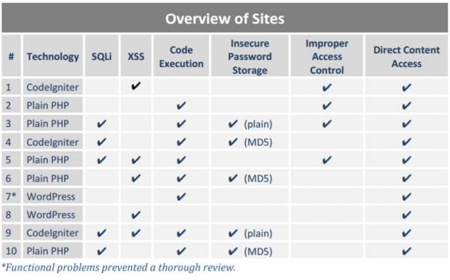 Les applicatifs ne sont donc pas beaucoup améliorés, et l'on regarde la sécurité. Aucun site ne prend de mesures contre un tentative d'upload d'un WebShell, la plupart permettent de passer outre l'authentification avec une injection SQL et globalement toutes les vulnérabilités classiques sont trouvées.
