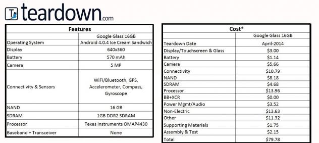 Les auteurs de cette enquête ont examiné les composants des Google Glass pour aboutir à un prix de revient de 79,78 dollars exactement. Le composant le plus cher est le microprocesseur : 13,96 dollars.