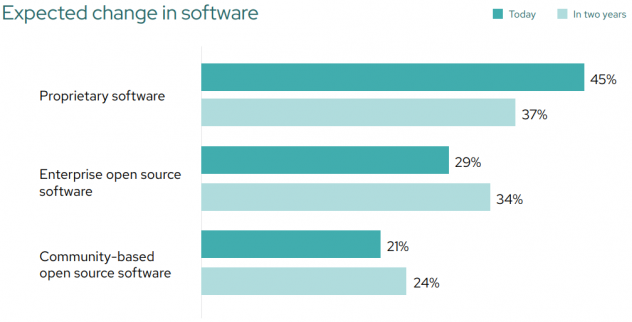 Selon l'étude Red Hat, les logiciels propriétaires n'occupent plus que 45% du parc des entreprises, une part qui devrait se réduire à 37% d'ici 2 ans.