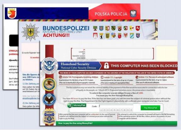 En ce qui concerne les ransonwares, le plus actif est Win32/Reveton. Celui-ci verrouille l'ordinateur et affiche une age web qu couvre tout l'écran, demandant à l'utilisateur de s'acquitter d'une amende pour possession de illégale de logiciel.