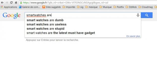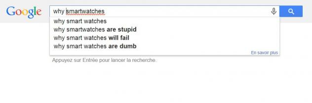 Cette auto-completion qui est le reflet des requêtes les plus souvent tapées est assez impitoyable. En ce cas, elle témoigne que si les smartwatches sont un gadget incontournables pour certains, pour de nombreux autres, elles sont stupides et sans intérêt.
