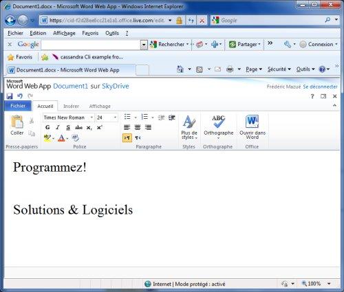Office Web Apps, version bridée de la suite bureautique, est accessible gratuitement. Il suffit d'avoir ouvert un compte Hotmail ou Live ID. Vous pourrez alors créer des documents Word, Excel, PowerPoint et OneNote depuis votre navigateur. Ces documents seront stockés en ligne sur le Cloud de Microsoft, et plus concrètement pour vous sur votre SkyDrive, et ceci dans une limite de 25 Go.