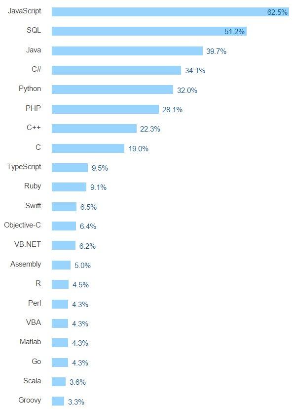 Les développeurs Web étant la majorité, il n'y a rien d'étonnant à ce que JavaScript et SQL soit les langages les plus utilisés. On remarque la bonne tenue de C et C++ indéboulonnables. Là encore les pourcentages impliquent que les développeurs sont rarement cantonnés à un seul langage.