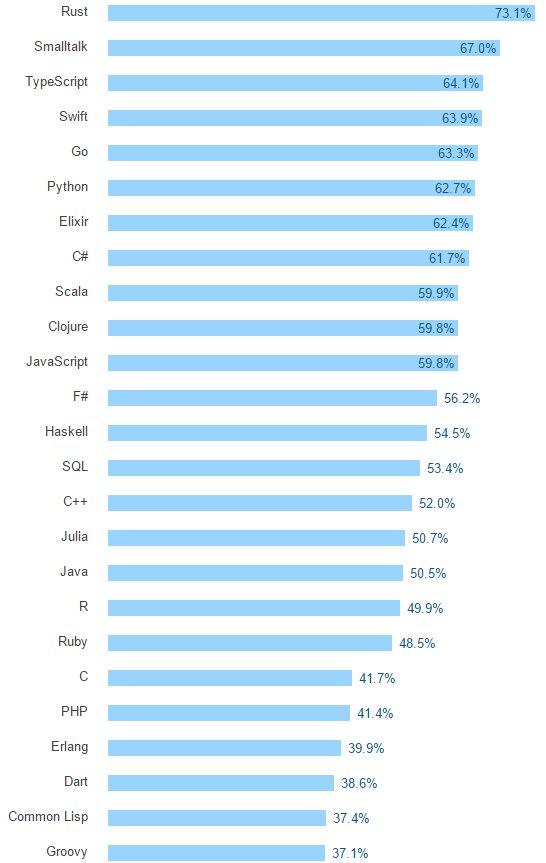Résultat étonnant (au moins pour votre serviteur), le langage que les développeurs apprécient le plus est un langage jeune : Rust, le langage proposé par la fondation Mozilla. Il est intéressant de noter que Smalltalk ou Haskell, à défaut d'être utilisés largement dans les projets pratiques sont appréciés par les développeurs, pour ce qu'ils sont intrinsèquement. Il est encore intéressant de noter que JavaScript, langage imposé et souvent critiqué s'il en est, est malgré tout aimé, à 59%. Aux yeux des développeurs, sont particulièrement redoutables : Visual Basic 6, VBA, VB.NET, Objective C et l'assembleur. Comme quoi les développeurs sont des gens de bon goût :-)