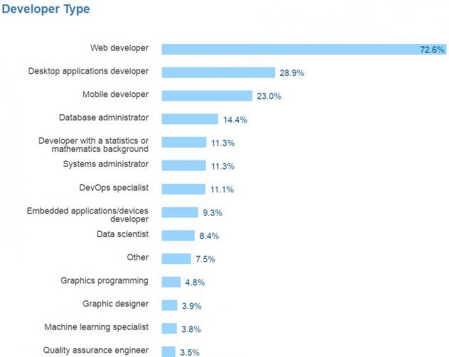 L'activité qui a le vent en poupe est le développement Web. 72,6% des développeurs y travaillent, ce qui est une proportion considérable. Mais presque un quart des développeurs sont aussi des développeurs pour mobile. Le total des pourcentages dans le graphique ci-dessous dépassant allégrement les 100%, on en déduit que nombreux sont les développeurs qui ont plusieurs casquettes :-)