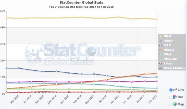 Selon Statcounter Windows XP est passé de 11,99% à 12,23% de parts de marché en février. Tandis que selon Netmarketshare, Windows XP passe de 18,93% à 19,15%.