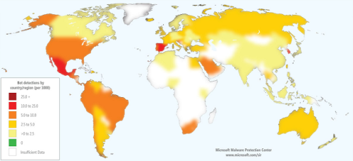 Les recherches de Microsoft révèlent aussi des variations de l’importance de la menace des botnets en fonction de la zone géographique : au cours des six premiers mois de 2010, les États-Unis ont subi la plus forte infection due aux botnets (2,2 millions), suivis par le Brésil (550 000). En Europe, l'Espagne a eu le plus d'infections (382 000), suivie par la France, le Royaume-Uni et l'Allemagne. Les plus forts taux d'infection par botnets ont été relevés en Corée du Sud (14,6 infections de type botnet pour 1000 ordinateurs analysés), suivis par l'Espagne (12,4) et le Mexique (11,4).